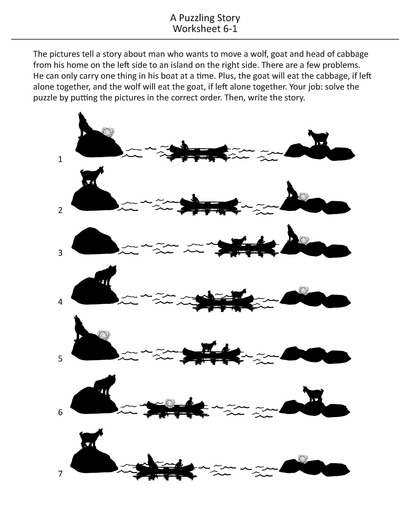 This flexible writing activity blends many layers of learning into one compact lesson. It is extremely versatile and can be adjusted to meet the needs of your class. The activity is based on a picture prompt which contains an old logic puzzle about a man who wants to cross a river with three things.