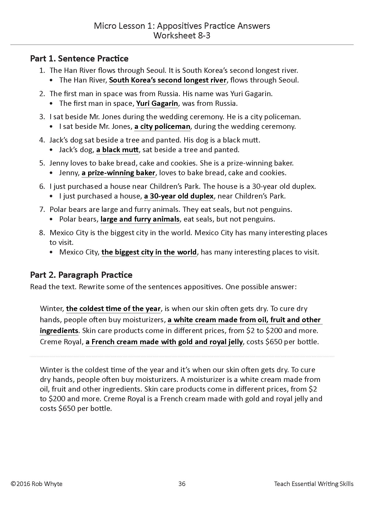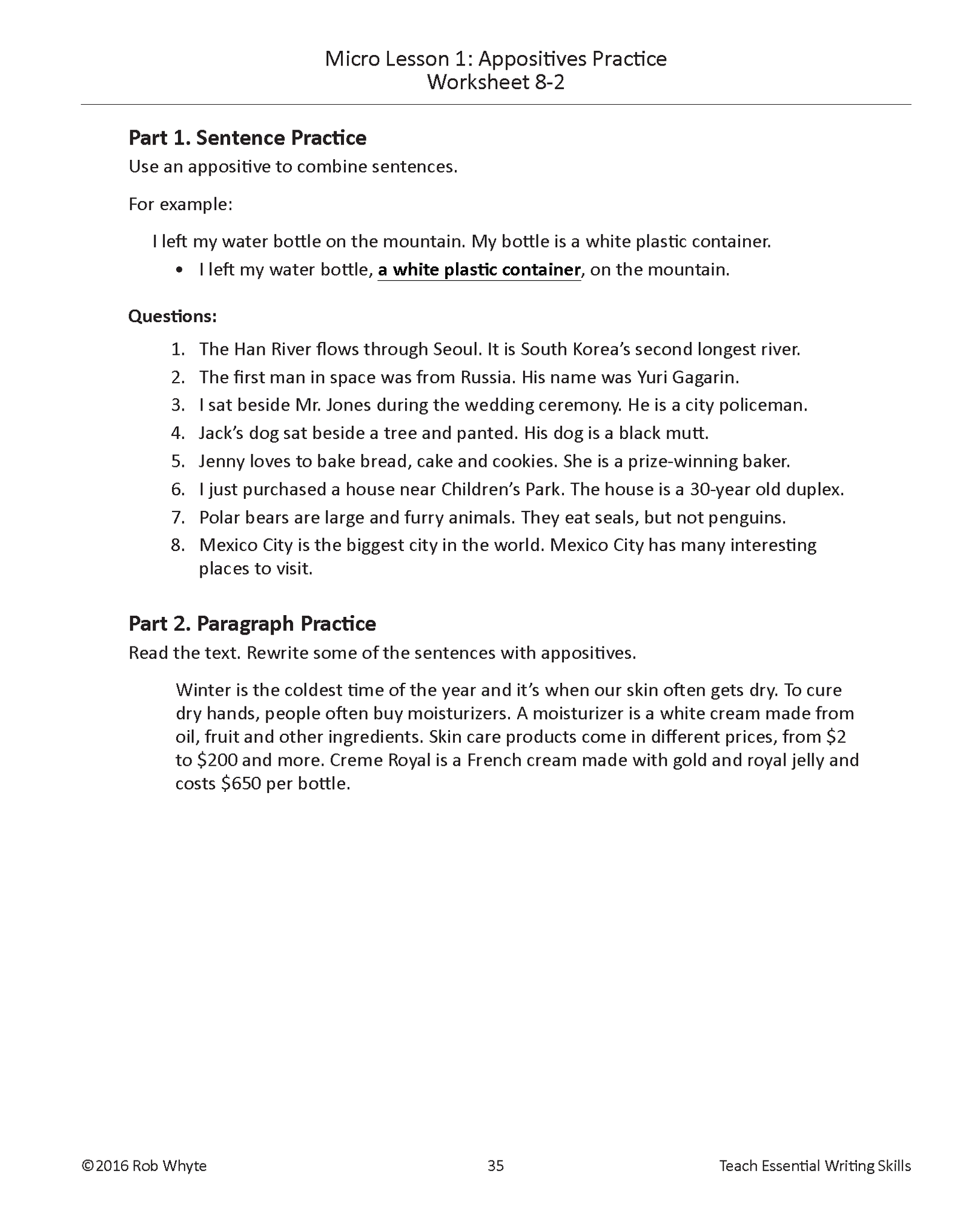 - Practice writing appositives with the sentence combining questions on Part 1 of Worksheet 8-2. Check answers on Worksheet 8-3.