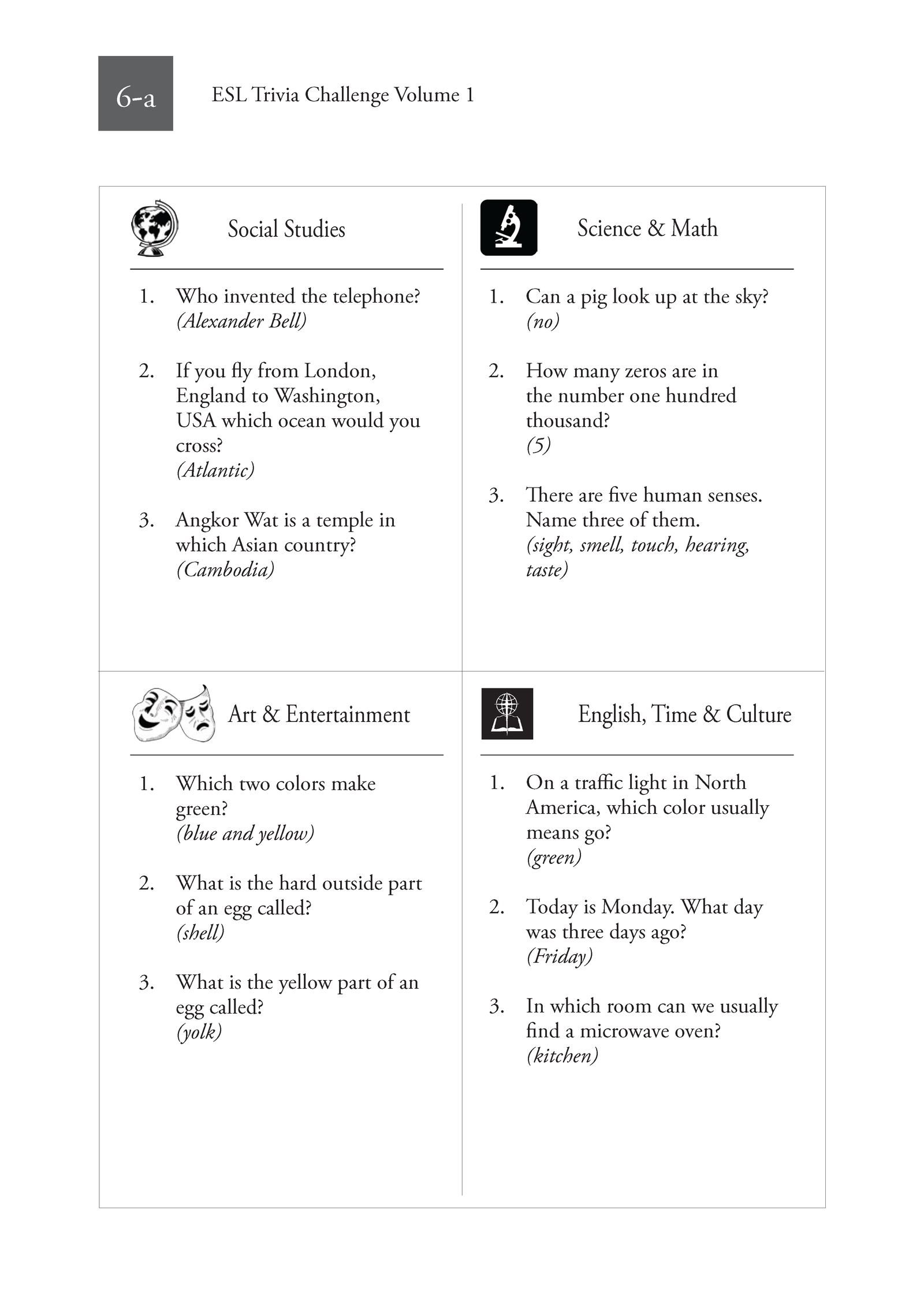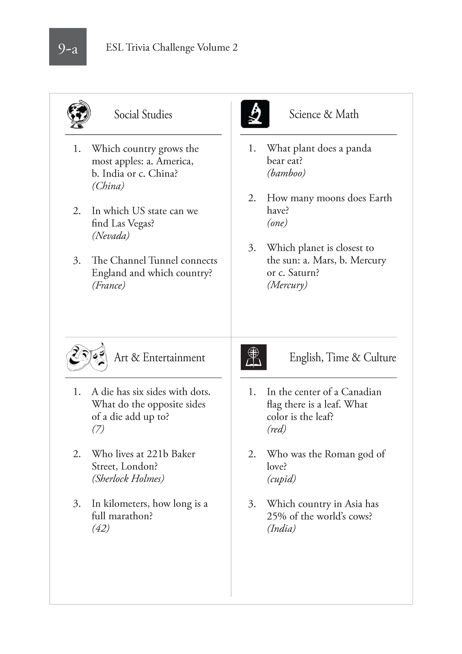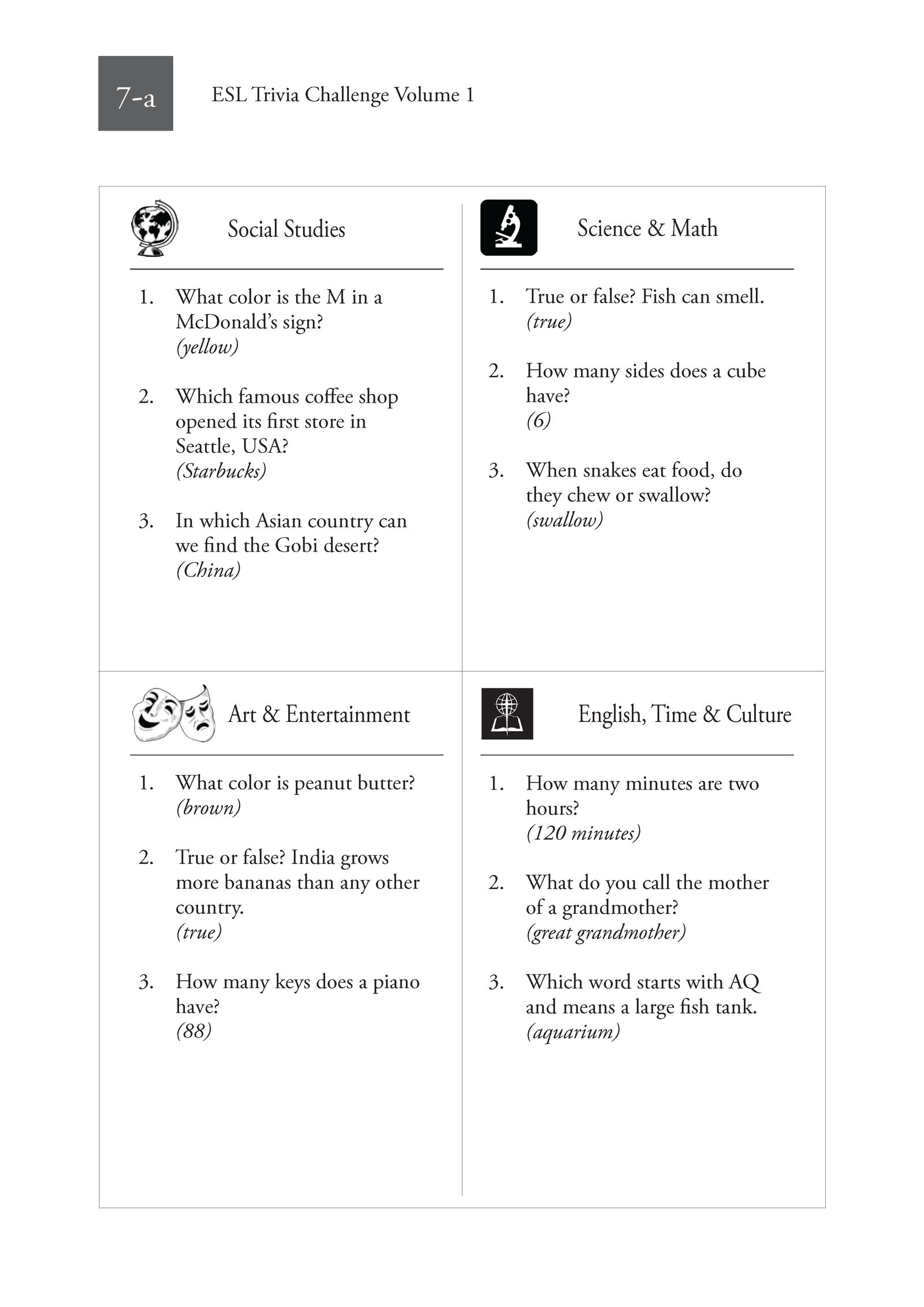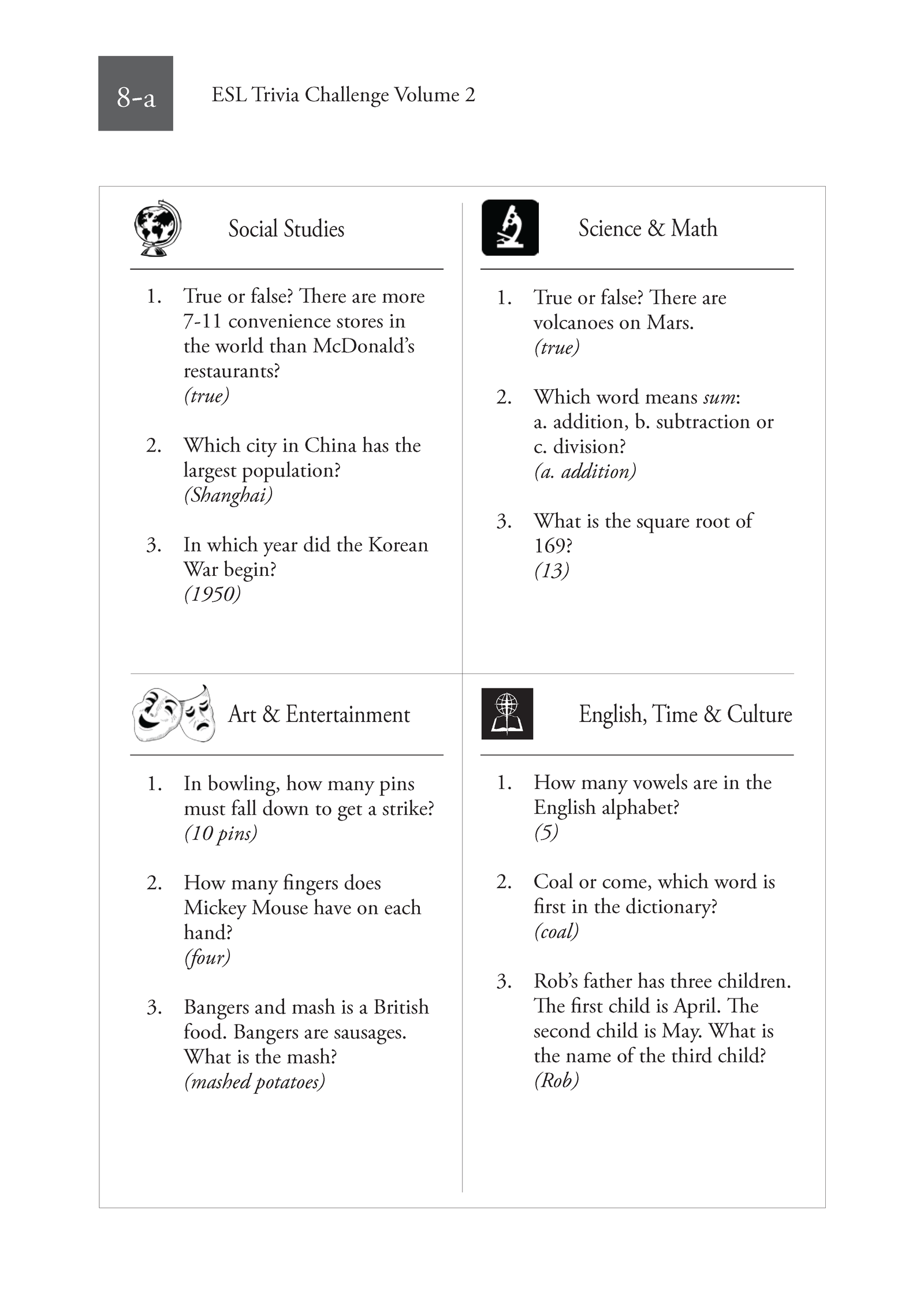 Finding trivia questions suitable for EFL students was difficult. The web has lots of questions but it requires some familiarity with American culture. So I created my own questions – 480 general knowledge questions about science, math, social studies, art, entertainment, English and culture.